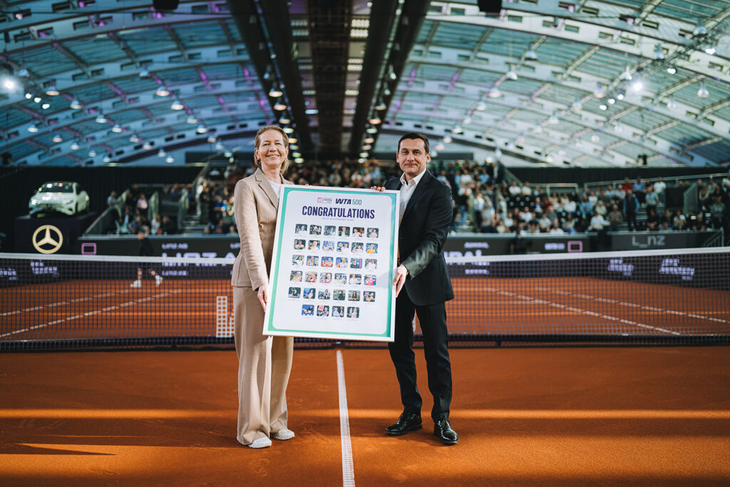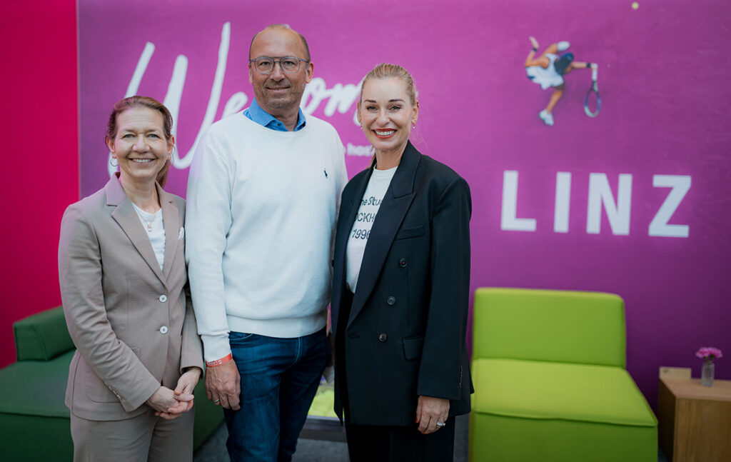 Raiffeisenlandesbank Oberösterreich presented the Players Alpine Night in the VIP area at the start of the tournament week. Now Raiffeisenlandesbank Upper Austria CEO Reinhard Schwendtbauer took the opportunity to drop by the Design Centre again on the final weekend and was welcomed by tournament director Sandra Reichel and tournament ambassador Barbara Schett.